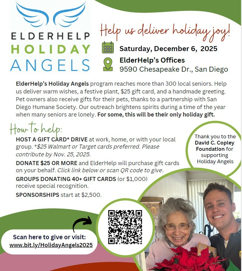 Many village members have already become Raise Right users, helping TVSD to bring in $700 in fundraising to date in 2025. The Raise Right platform allows users to purchase gift cards for popular stores and attractions while "giving back" a portion of sales to TVSD. If you have not yet signed up for Raise Right, please consider learning more. All the details are available here. You can also contact the Village Front Desk for more information. Thank you for your continued support of Tierrasanta Village! |  | | Elderhelp Holiday Angels